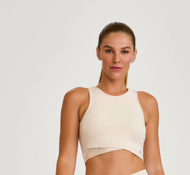 This cropped top in a soft beige tone features a sophisticated silhouette that enhances the natural shape with subtle elegance. Designed with an inner lining and built-in padding, it offers both comfort and support, adapting seamlessly to your routine.
