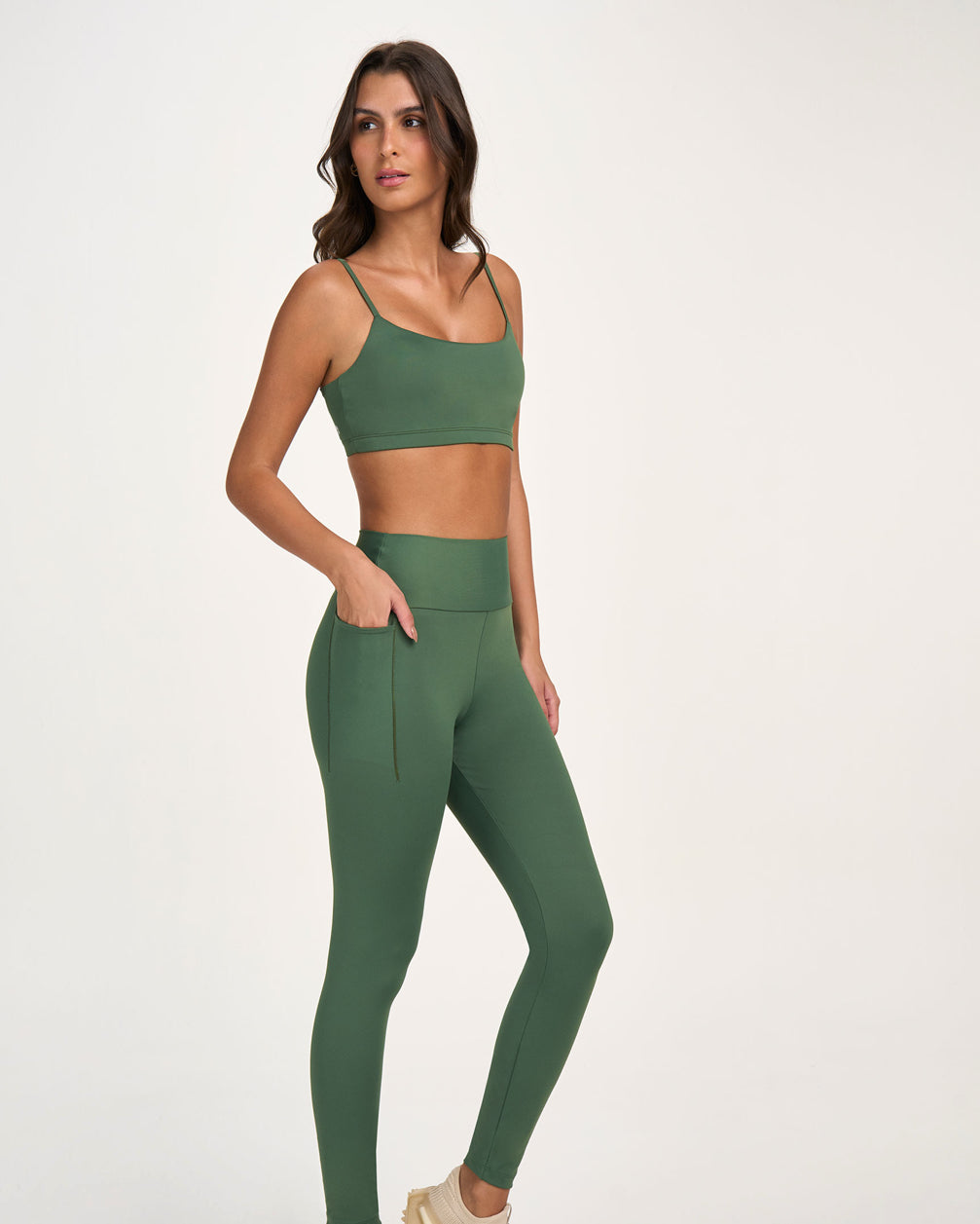 The military green leggings with side pockets are the perfect combination of functionality and style for your physical activities. Made with high-quality materials, they provide comfort, support and freedom of movement during your workouts. The side pocket offers practicality, allowing you to carry your essentials with ease, without compromising comfort. With a modern and versatile design, these leggings are ideal for those looking to combine performance and practicality in their exercise routines.